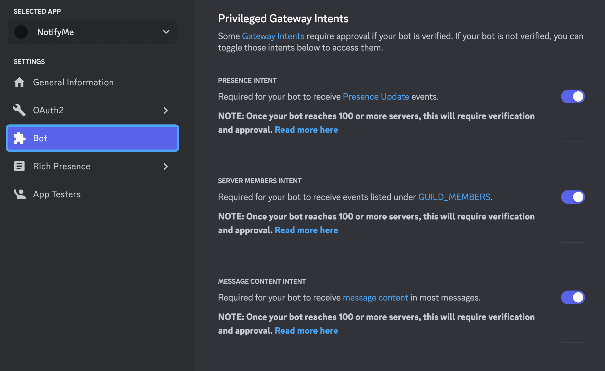 - Go to Bot tab and enable the privileged Gateway Intents. This is needed for bot to read messages.